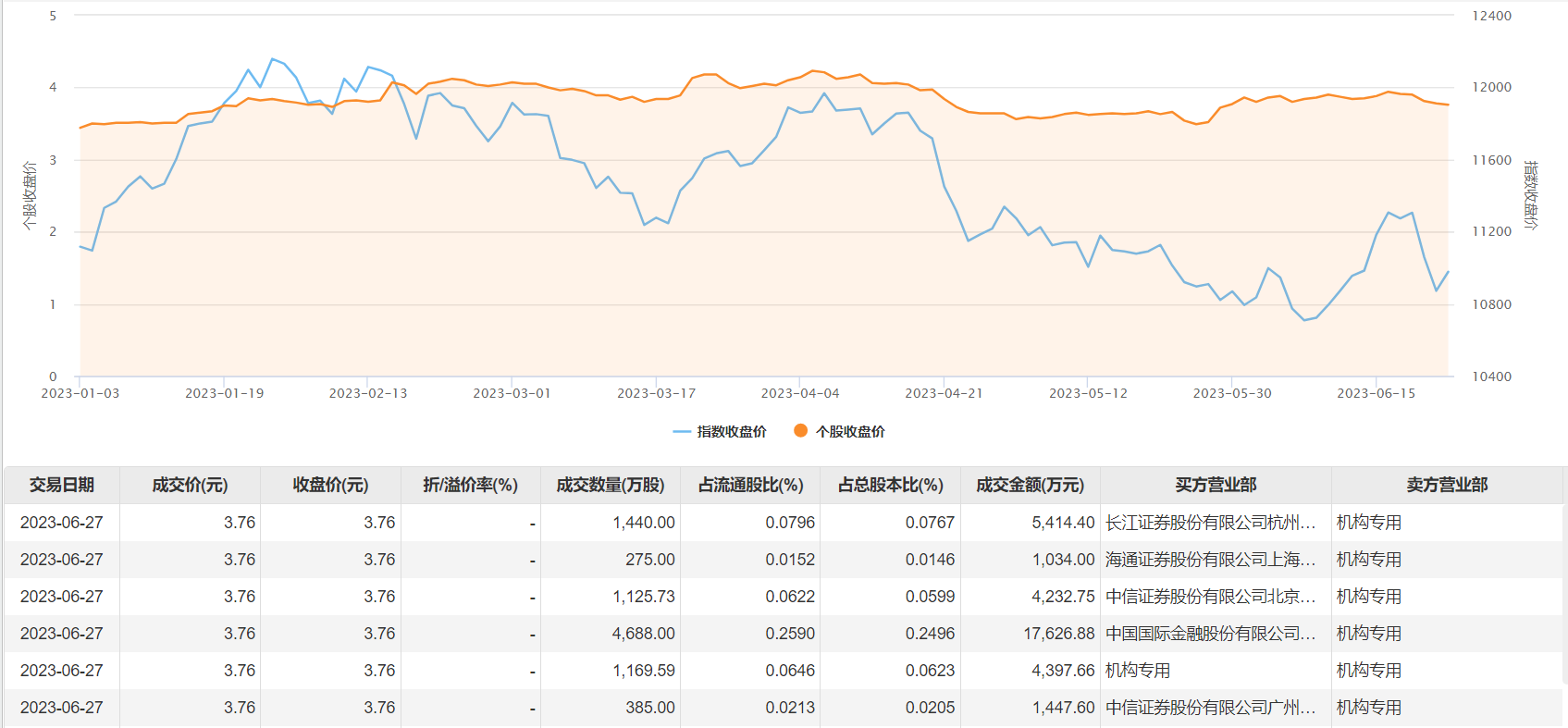 6月27日大宗交易成交9083.32万股,成交额3.42亿元,占当日总成交额的19.07%,成交价3.76元,较市场收盘价3.76元持平。