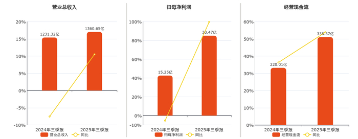 公司营业总收入为1360.65亿元。归母净利润为30.47亿元。经营活动现金净流入为338.37亿元。
