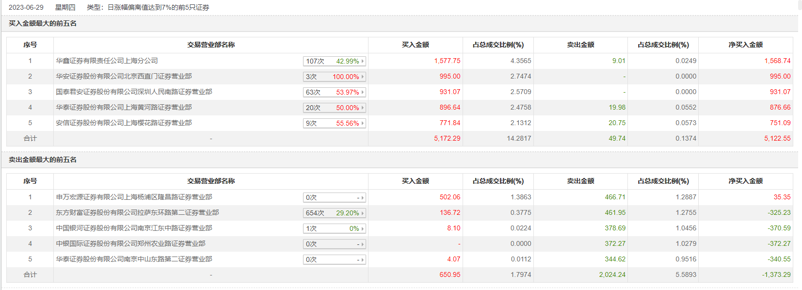 具体来看,华鑫证券上海分公司、华安证券北京西直门证券营业部分别买入1577.75万元、995.00万元;申万宏源证券有限公司上海杨浦区隆昌路证券营业部、东方财富证券拉萨东环路第二证券营业部分别卖出466.71万元、461.95万元。