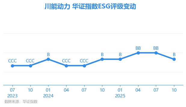 日前,华证指数公布了新一期(2025年10月31日)的ESG评级结果,川能动力(000155.SZ)获得B评级(华证指数评级为C起至AAA九档,C为最低档,AAA为其最高一级评级/AA为其第二档),上一期(2025年7月31日)ESG评级为BB。本期ESG评级在58家电力公用事业行业A股上市公司中排名第30(上一期排名第24)。