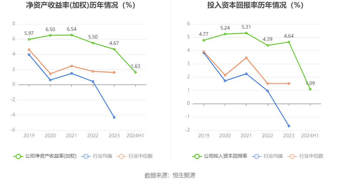 数据显示,2024年上半年公司加权平均净资产收益率为1.63%,较上年同期下降0.82个百分点;公司2024年上半年投入资本回报率为1.09%,较上年同期下降0.44个百分点。