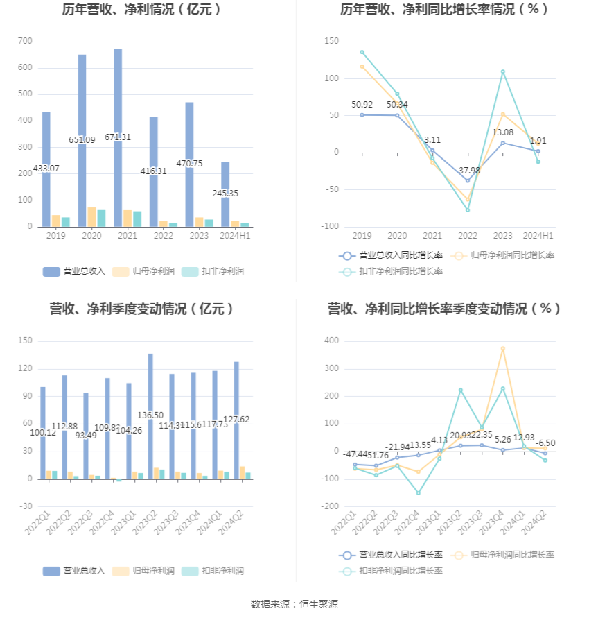 根据半年报,公司第二季度实现营业总收入127.62亿元,同比下降6.50%,环比增长8.40%;归母净利润13.72亿元,同比增长11.56%,环比增长49.84%;扣非净利润7.03亿元,同比下降32.29%,环比下降9.65%。