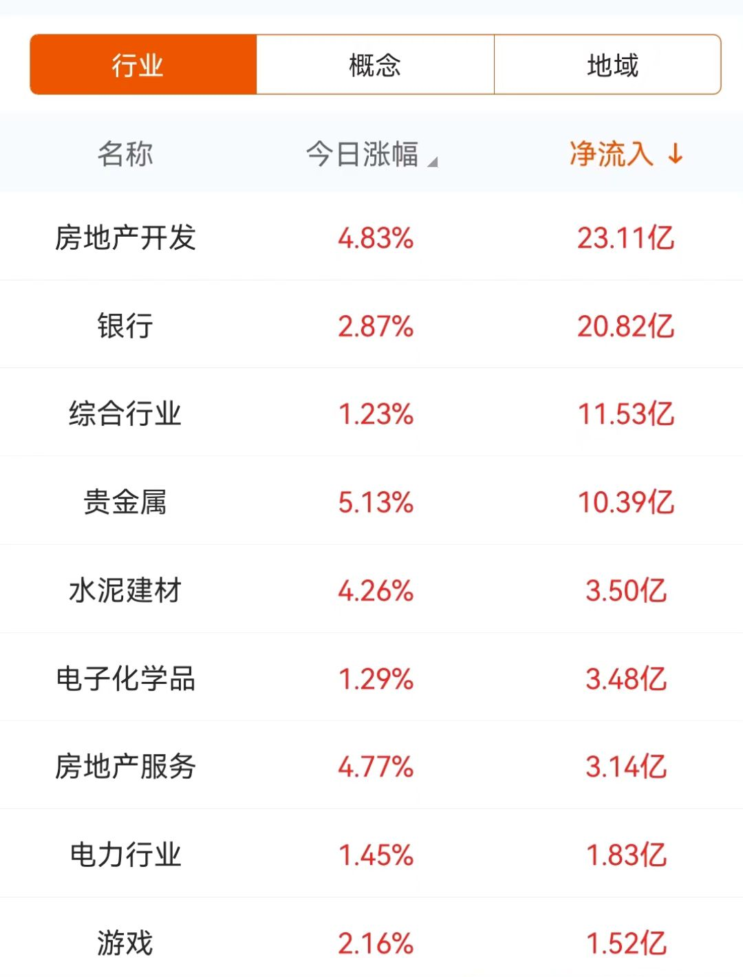 周三地产开发、银行等板块主力净流入,其中地产开发净流入23.11亿元。