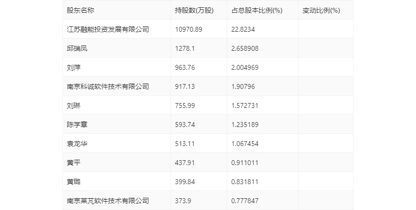 半年报显示,2024年上半年末公司十大流通股东中,新进股东为陈学章、黄平、南京莱芃软件技术有限公司,取代了一季度末的姜强国、黄琰、肖建红。在具体持股比例上,邱瑞凤、南京科诚软件技术有限公司持股有所上升。