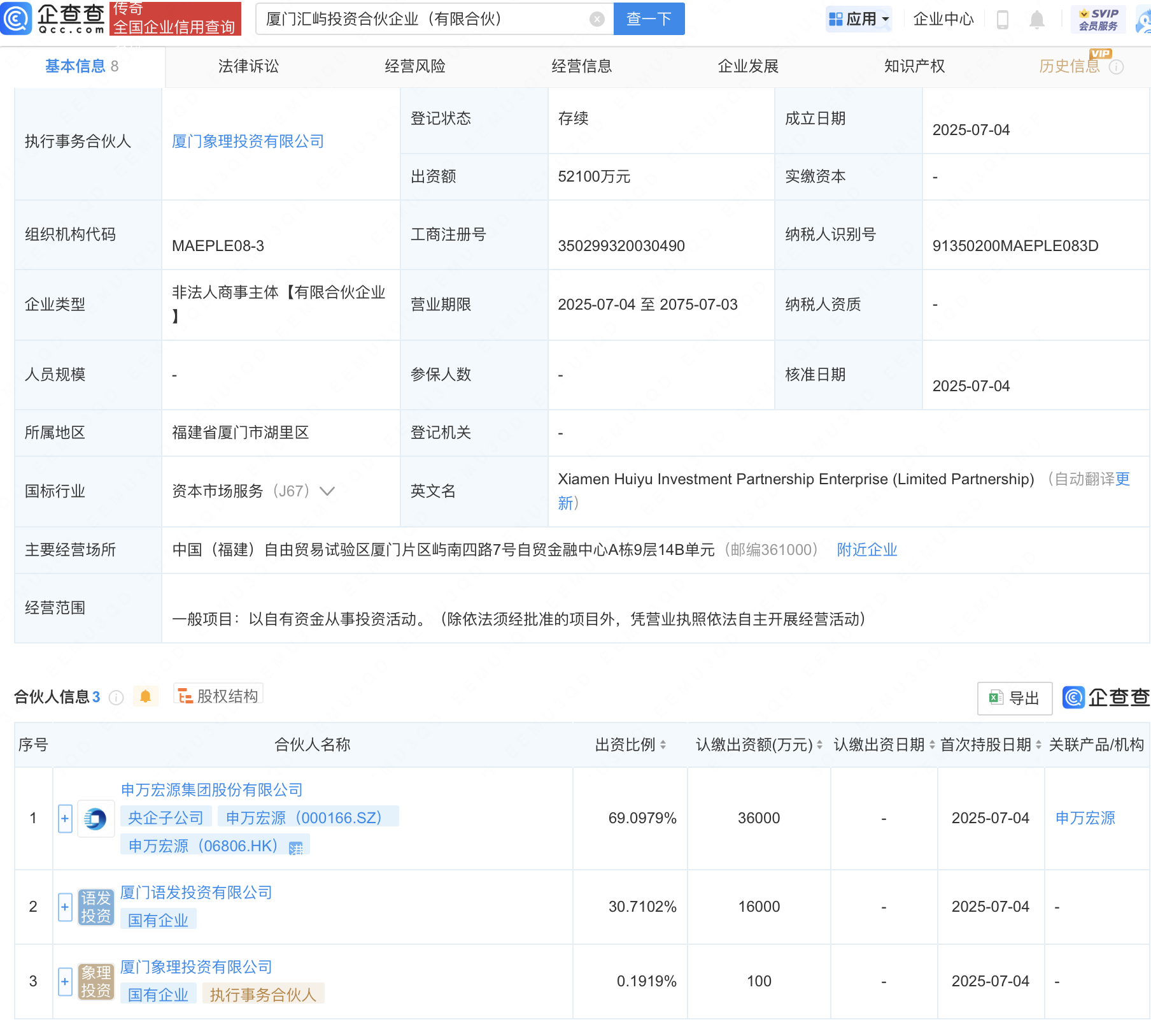 企查查APP显示,近日,厦门汇屿投资合伙企业(有限合伙)成立,出资额5.21亿元,经营范围包含:以自有资金从事投资活动。企查查股权穿透显示,该企业由申万宏源(000166)等共同出资。