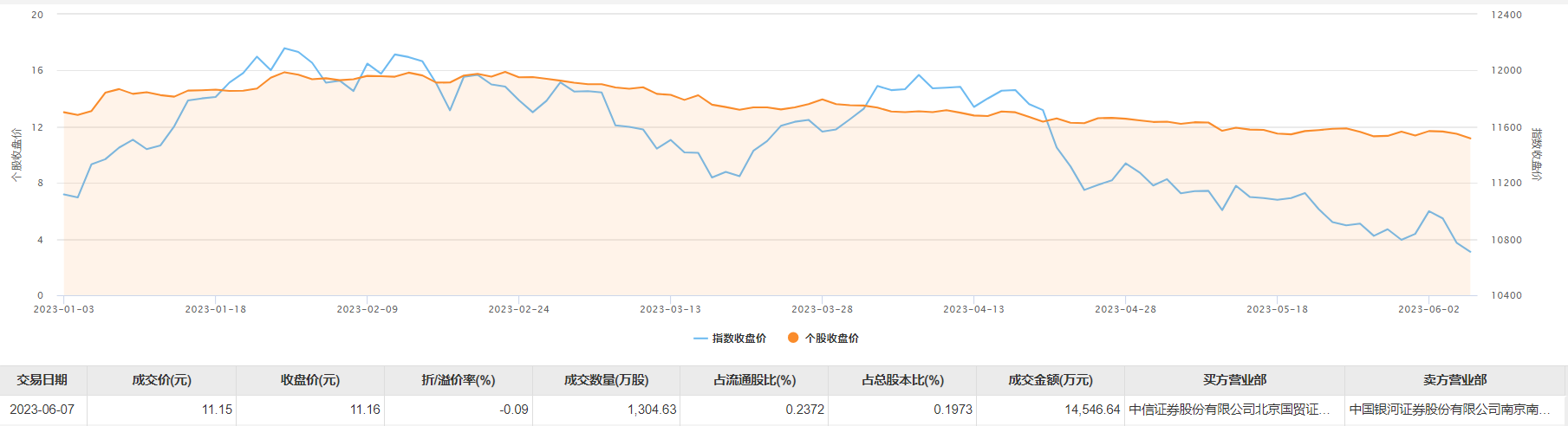 6月7日大宗交易成交1304.63万股,成交额1.45亿元,占当日总成交额的32.71%,成交价11.15元,较市场收盘价11.16元折价0.09%。