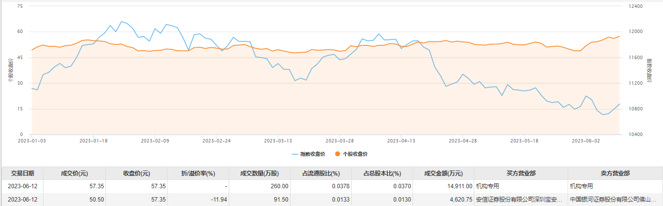 美的集团6月12日大宗交易成交351.5万股,成交额1.95亿元,占当日总成交额的7.97%,成交均价55.57元,较市场收盘价57.35元折价3.1%,其中最高成交价57.35元,最低成交价50.5元。