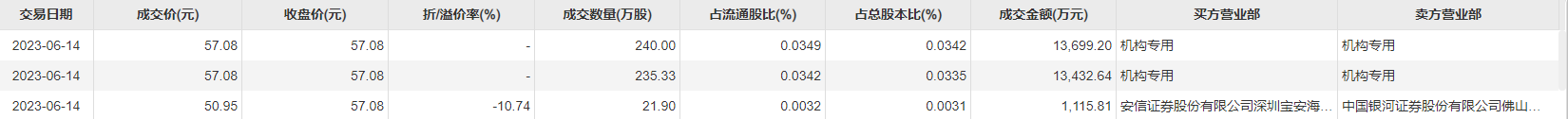 美的集团6月14日大宗交易成交497.23万股,成交额2.82亿元,占当日总成交额的12.07%,成交均价56.81元,较市场收盘价57.08元折价0.47%,其中最高成交价57.08元,最低成交价50.95元。