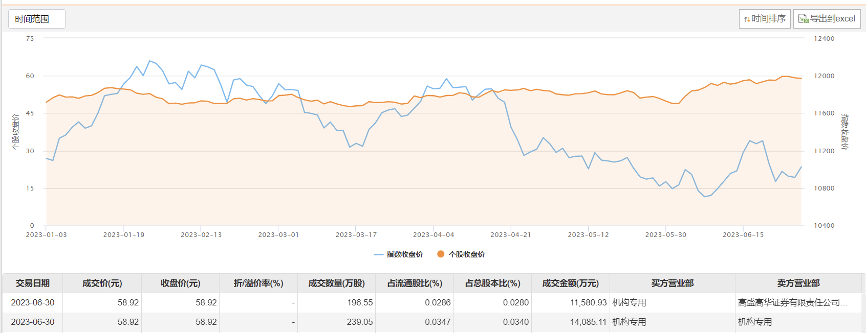 6月30日大宗交易成交435.6万股,成交额2.57亿元,占当日总成交额的14.1%,成交价58.92元,较市场收盘价58.92元持平。