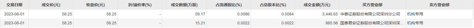 8月1日大宗交易成交74.38万股,成交额4332.63万元,占当日总成交额的3.49%,成交价58.25元,较市场收盘价58.25元持平。
