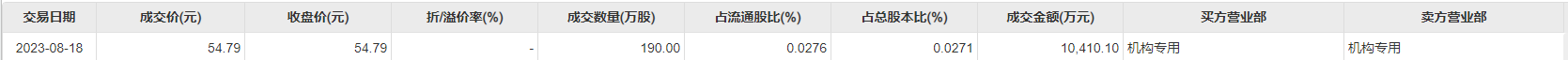 今日大宗交易成交190万股,成交额1.04亿元,占当日总成交额的12.32%,成交价54.79元,较市场收盘价持平。