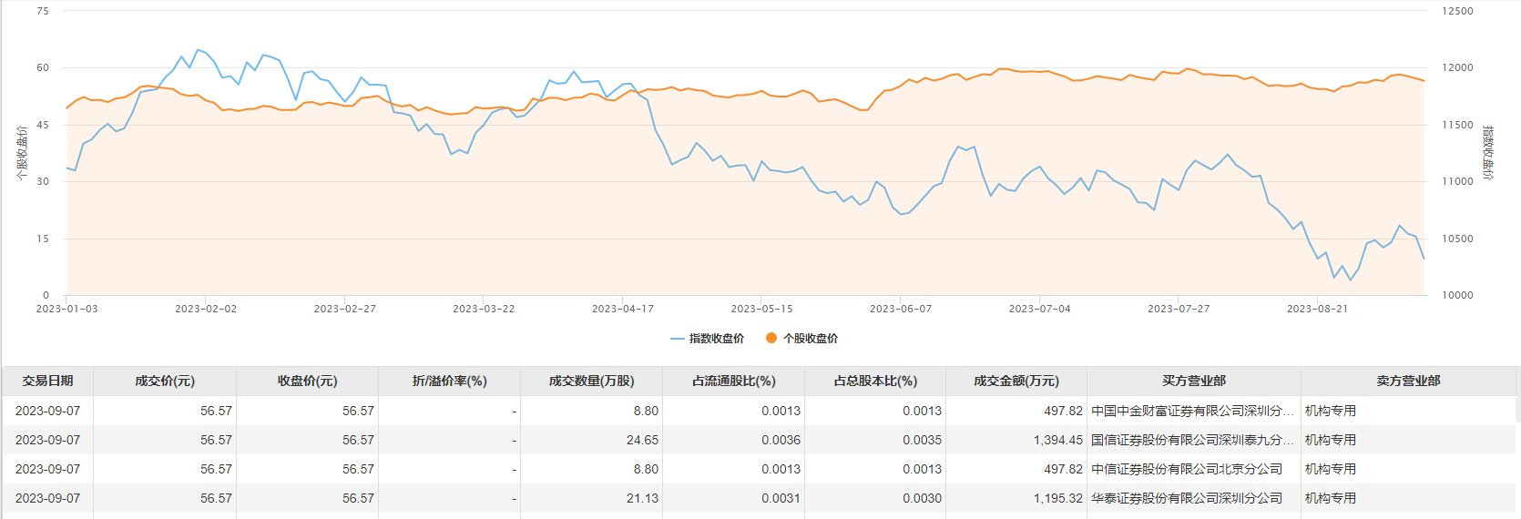 9月7日大宗交易成交63.38万股,成交额3585.41万元,占当日总成交额的4.43%,成交价56.57元,较市场收盘价56.57元持平。