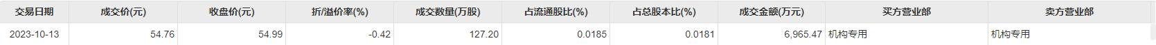 今日大宗交易成交127.2万股,成交额6965.47万元,占当日总成交额的8.9%,成交价54.76元,较市场收盘价折价0.42%。