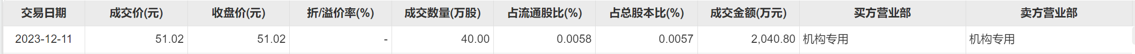 今日大宗交易成交40万股,成交额2040.8万元,占当日总成交额的1.58%,成交价51.02元,较市场收盘价持平。