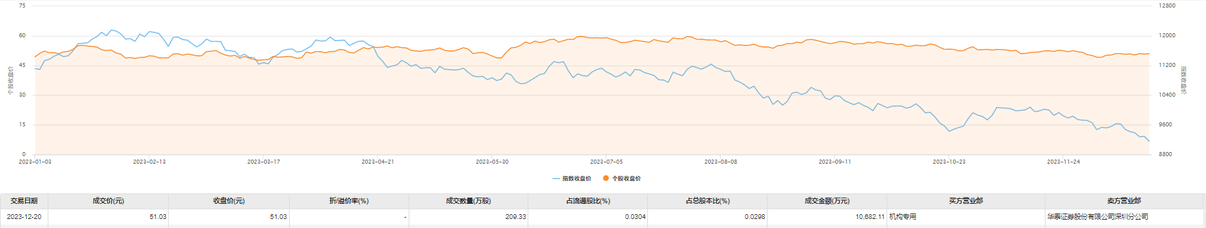 今日大宗交易成交209.33万股,成交额1.07亿元,占当日总成交额的7.6%,成交价51.03元,较市场收盘价持平。