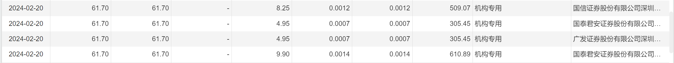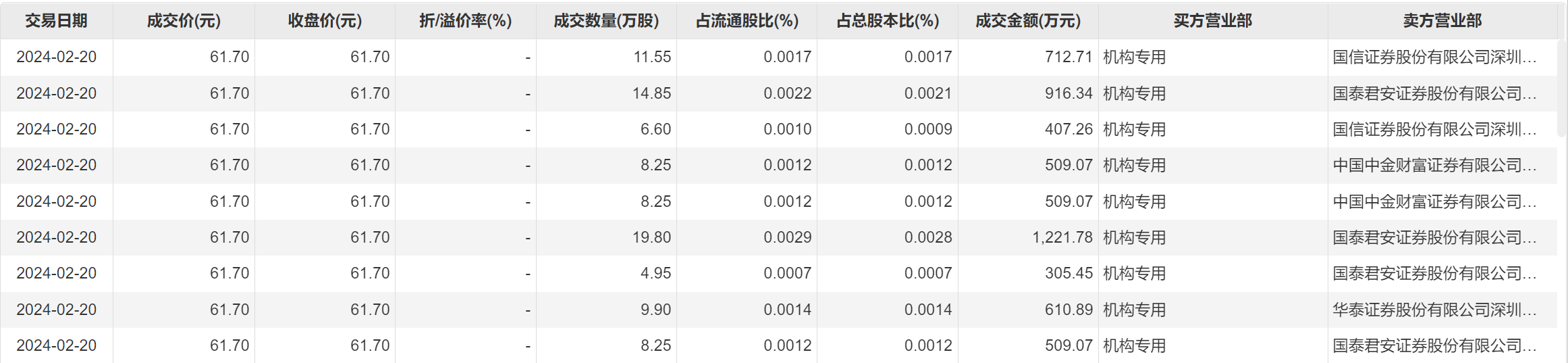 2月20日大宗交易成交120.45万股,成交额7432.5万元,占当日总成交额的3.95%,成交价61.71元。