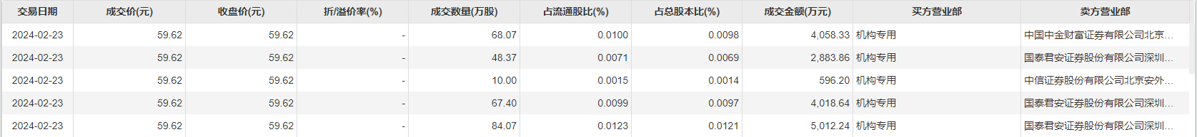 2月23日,美的集团今日出现1.66亿元平价大宗交易,成交价59.62元/股。买方为机构专用席位,卖方为中金财富证券北京北三环东路营业部、中信证券北京安外大街营业部、国泰君安深圳深南大道京基一百证券营业部。