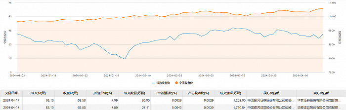 4月17日大宗交易成交47.11万股,成交额2972.64万元,占当日总成交额的1.75%,成交价63.1元,较市场收盘价68.58元折价7.99%。