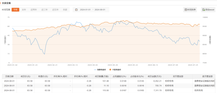 今日大宗交易成交227.58万股,成交额1.45亿元,占当日总成交额的8.48%,成交价63.58元,较市场收盘价持平。