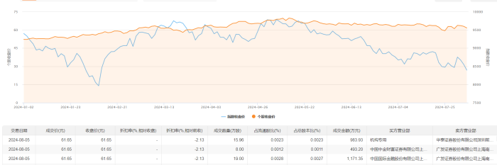 8月5日大宗交易成交42.96万股,成交额2648.48万元,占当日总成交额的1.18%,成交价61.65元,较市场收盘价61.65元持平。