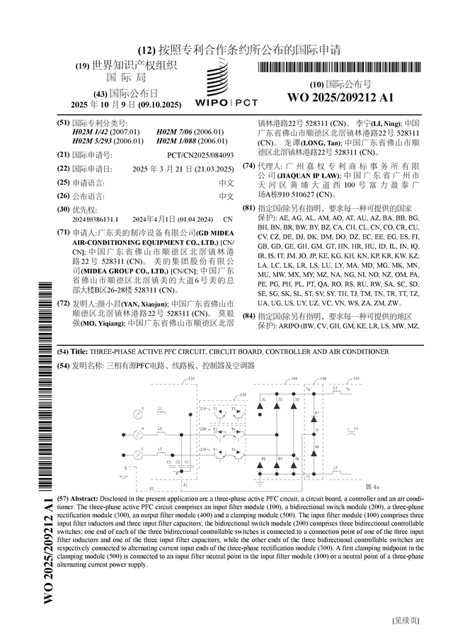 美的集团公布国际专利申请:“三相有源PFC电路、线路板、控制器及空调器”
