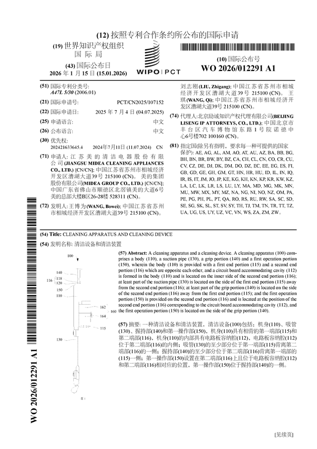 美的集团公布国际专利申请:“清洁设备和清洁装置”
