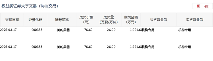 3月17日,美的集团大宗交易成交52万股,成交额3983.2万元,占当日总成交额的2.36%,成交价76.6元,较市场收盘价76.6元持平。