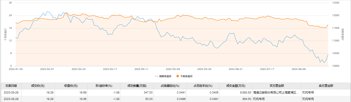 8月29日大宗交易成交397万股,成交额7658.13万元,占当日总成交额的17.09%,成交价19.29元,较市场收盘价19.66元折价1.88%。