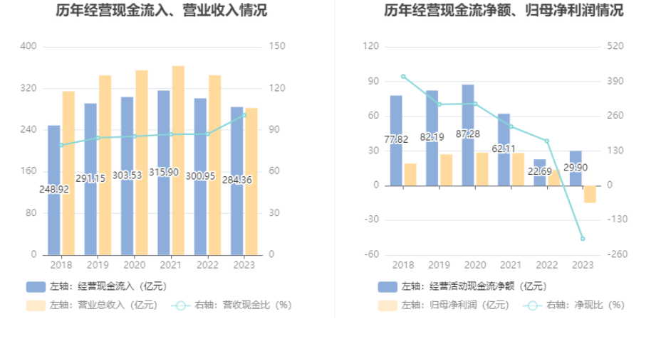 2023年,公司经营活动现金流净额为29.90亿元,同比增长31.75%;筹资活动现金流净额-12.49亿元,同比减少2.73亿元;投资活动现金流净额-18.93亿元,上年同期为-24.45亿元。