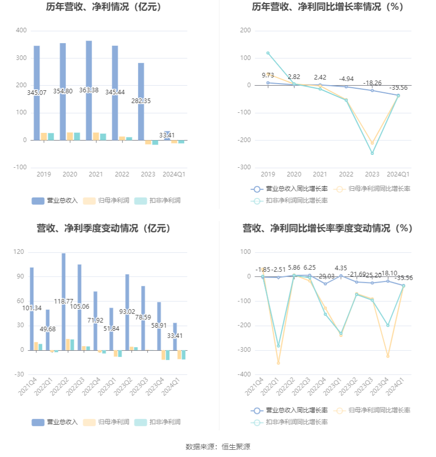 2024年第一季度,公司毛利率为-2.25%,同比下降7.28个百分点;净利率为-36.30%,较上年同期下降19.14个百分点。