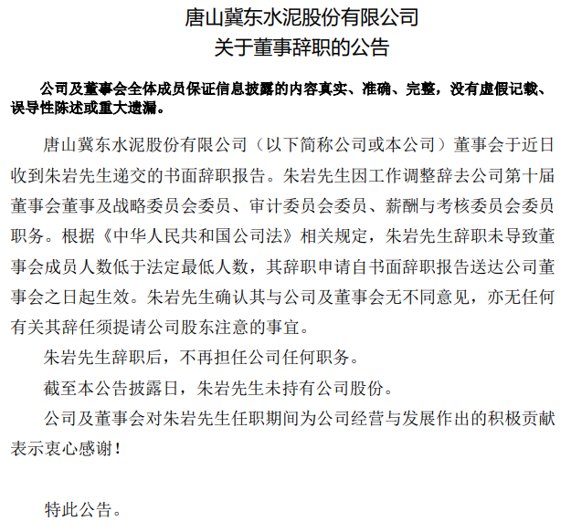 同日,冀东水泥业发布公告显示,董事朱岩因工作调整辞去公司第十届董事会董事及多个委员会职务。