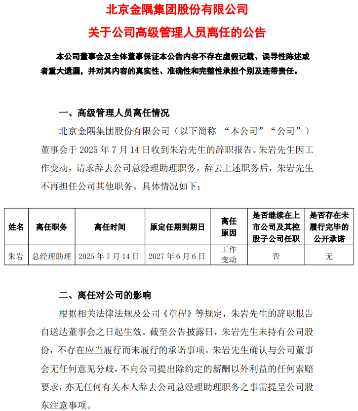 7月14日,金隅集团发布公告显示,朱岩先生因工作变动,请求辞去公司总经理助理职务。辞去上述职务后,朱岩先生不再担任公司其他职务。