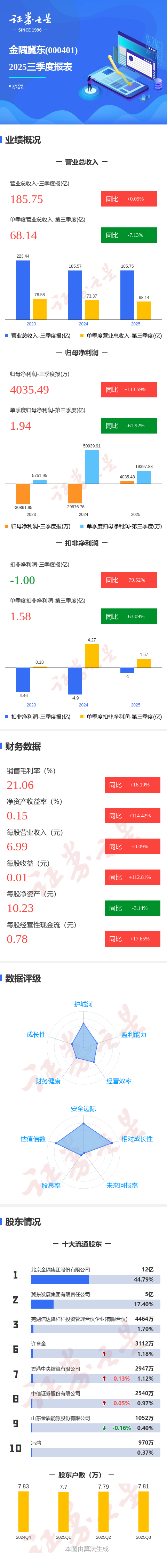 证券之星消息,金隅冀东2025年三季报显示,公司主营收入185.75亿元,同比上升0.1%;归母净利润4035.49万元,同比上升113.6%;扣非净利润-1.0亿元,同比上升79.53%;其中2025年第三季度,公司单季度主营收入68.14亿元,同比下降7.13%;单季度归母净利润1.94亿元,同比下降61.92%;单季度扣非净利润1.58亿元,同比下降63.1%;负债率49.59%,投资收益9508.29万元,财务费用3.52亿元,毛利率21.06%。