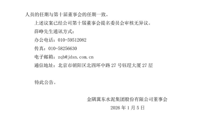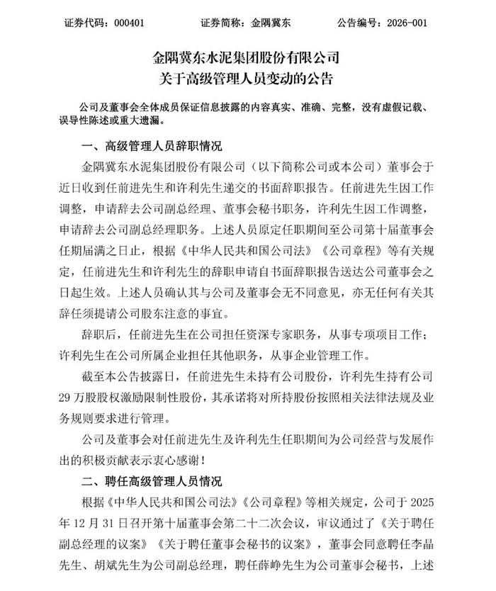 2026年1月5日,金隅冀东水泥集团股份有限公司发布两则公告,披露公司高级管理人员变动情况。