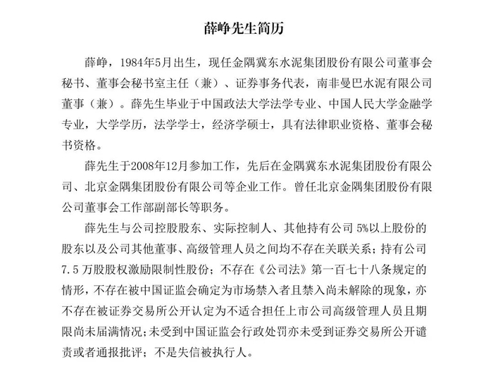 薛峥先生为法学学士、经济学硕士,持有法律职业资格及董事会秘书资格,兼具法律与金融专业素养,此前曾任北京金隅集团股份有限公司董事会工作部副部长,现任公司董事会秘书室主任、证券事务代表及南非曼巴水泥有限公司董事。