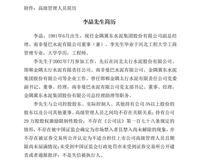 公开简历显示,李晶先生为大学学历、工程师,拥有多年水泥行业从业经验,曾任邯郸金隅太行水泥有限责任公司经理、南非曼巴水泥有限公司经理等职,目前还兼任南非曼巴水泥有限公司董事。
