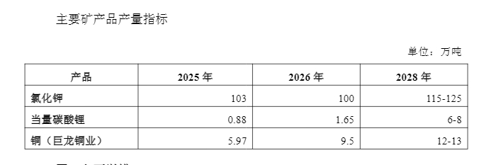 具体产量规划上市,2025年至2028年,公司氯化钾产量计划从103万吨提升至115-125万吨,碳酸锂产量从0.88万吨增加至6-8万吨,铜(巨龙铜业)产量则由5.97万吨增加至12-13万吨。