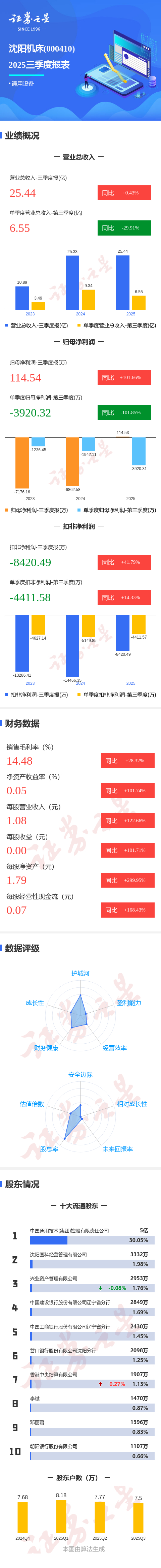 证券之星消息,沈阳机床2025年三季报显示,前三季度公司主营收入25.44亿元,同比上升0.44%;归母净利润114.54万元,同比上升101.67%;扣非净利润-8420.49万元,同比上升41.79%;其中2025年第三季度,公司单季度主营收入6.55亿元,同比下降29.92%;单季度归母净利润-3920.32万元,同比下降101.86%;单季度扣非净利润-4411.58万元,同比上升14.34%;负债率54.98%,投资收益104.09万元,财务费用574.85万元,毛利率14.48%。