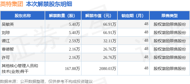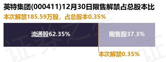 英特集团(000411)185.59万股限售股将于12月30日解禁,占总股本0.35%
