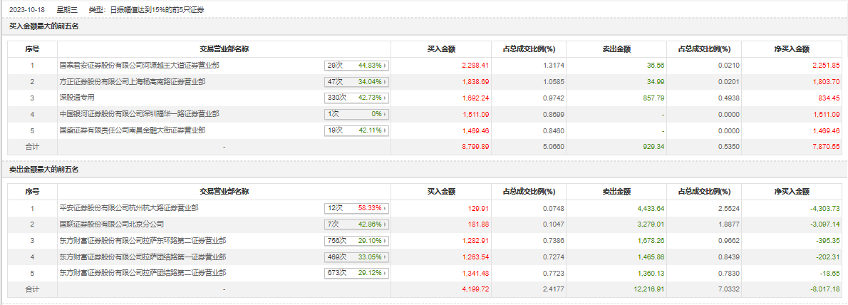 10月18日,东旭光电今日涨停,全天换手率达14.57%,振幅达16.02%。龙虎榜数据显示,营业部席位合计净卖出146.63万元。其中,国泰君安证券河源越王大道证券营业部、方正证券上海杨高南路证券营业部分别买入2288.41万元、1838.69万元;平安证券杭州杭大路证券营业部、国联证券北京分公司分别卖出4433.64万元、3279.01万元。