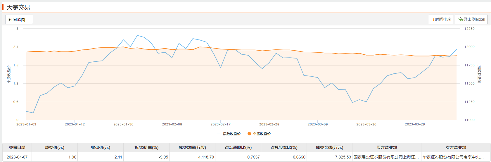 4月7日大宗交易成交4118.7万股,成交额7825.53万元,占当日总成交额的75.83%,成交价1.9元,较市场收盘价2.11元折价9.95%。
