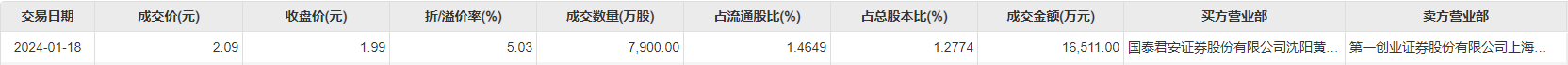 今日大宗交易成交7900万股,成交额1.65亿元,占当日总成交额的57.19%,成交价2.09元,较市场收盘价溢价5.03%。