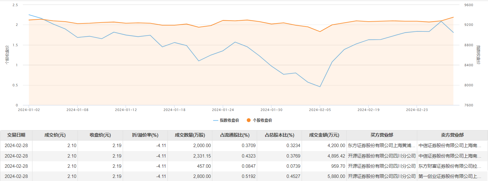 2月28日大宗交易成交7588.15万股,成交额1.59亿元,占当日总成交额的25.59%,成交价2.1元,较市场收盘价2.19元折价4.11%。