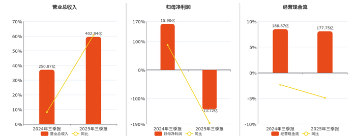 公司营业总收入为402.84亿元,在已披露的同业公司中排名第1,较去年同报告期营业总收入增加151.97亿元,实现4年连续上涨,同比较去年同期上涨60.58%。归母净利润为-13.72亿元,在已披露的同业公司中排名第27,较去年同报告期归母净利润减少29.63亿元,同比较去年同期下降186.31%。经营活动现金净流入为177.75亿元,在已披露的同业公司中排名第1,较去年同报告期经营活动现金净流入减少9.12亿元,同比较去年同期下降4.88%。