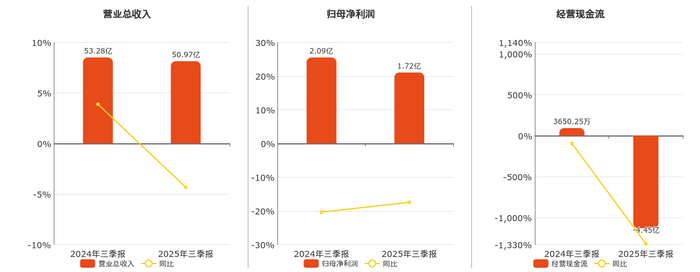 公司营业总收入为50.97亿元,在已披露的同业公司中排名第15,较去年同报告期营业总收入减少2.30亿元,同比较去年同期下降4.33%。归母净利润为1.72亿元,在已披露的同业公司中排名第12,较去年同报告期归母净利润减少3649.36万元,同比较去年同期下降17.48%。经营活动现金净流入为-4.45亿元,在已披露的同业公司中排名第57,较去年同报告期经营活动现金净流入减少4.82亿元,同比较去年同期下降1320.44%。