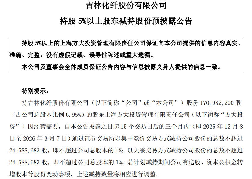 11月14日,吉林化纤(000420.SZ)发布公告,持股6.95%的股东上海方大投资管理有限责任公司(简称“方大投资”)因经营需要,自本公告披露之日起15个交易日后的三个月内(即2025年12月8日至2026年3月7日)通过证券交易所以集中竞价交易方式减持公司股份的总数不超过2458.87万股,即不超过公司总股本的1%;以大宗交易方式减持公司股份的总数不超过2458.87万股,即不超过公司总股本的1%。
