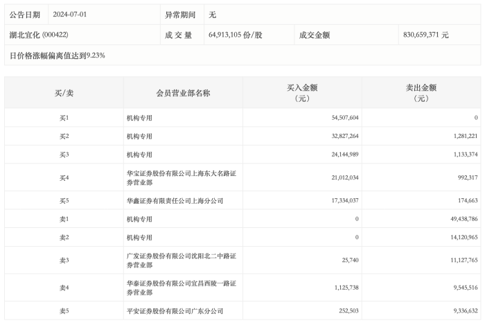 7月1日,湖北宜化今日涨停,龙虎榜数据显示,上榜营业部席位全天成交2.48亿元,占当日总成交金额比例为29.9%。其中,买入金额为1.51亿元,卖出金额为9715.12万元,合计净买入5407.87万元。