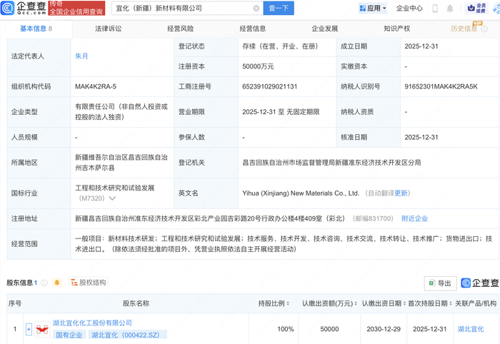 APP显示,近日,宜化(新疆)新材料有限公司成立,注册资本5亿元,经营范围包含:新材料技术研发;工程和技术研究和试验发展等。企查查股权穿透显示,该公司由湖北宜化(000422)全资持股。