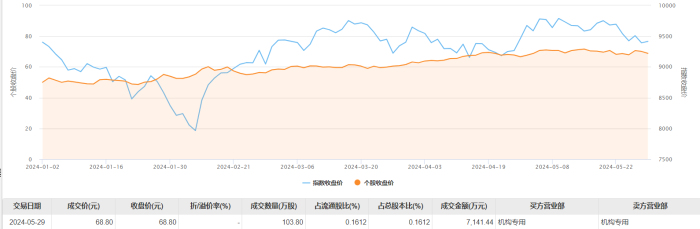 5月29日大宗交易成交103.8万股,成交额7141.44万元,占当日总成交额的20.18%,成交价68.8元,较市场收盘价68.8元持平。