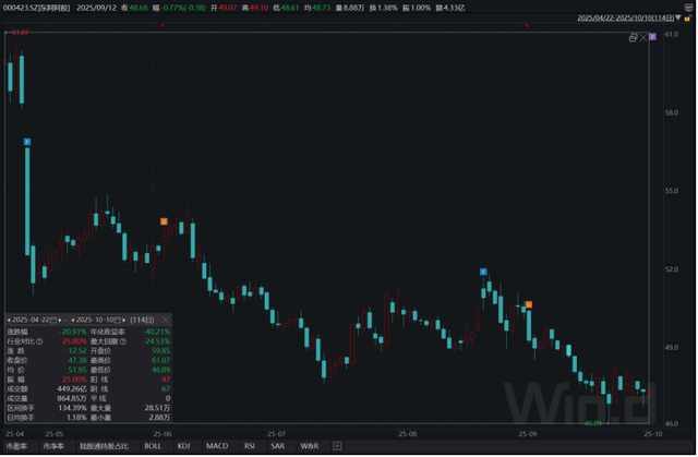 截至10月10日收盘,公司股价已跌至47.38元/股,自4月22日到10月10日,累计跌幅20.91%;最大回撤25.53%。